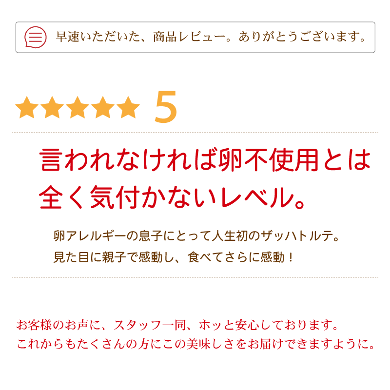濃厚な味わいやとろけるくちどけ…卵を使わないからと言って、妥協はしていません!極上の味わいを、どうぞお楽しみください。